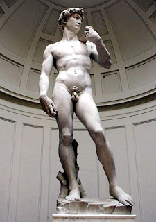 The sculpture of David is big and tall. His hands and feet are masculine. His stomach is very masculine and muscular. The arms are very strong. David has a perfect face. His eyes are almond shaped, his ears are normal and his lips are thin. His hair is wavy ... like "Mc Dreamy".
